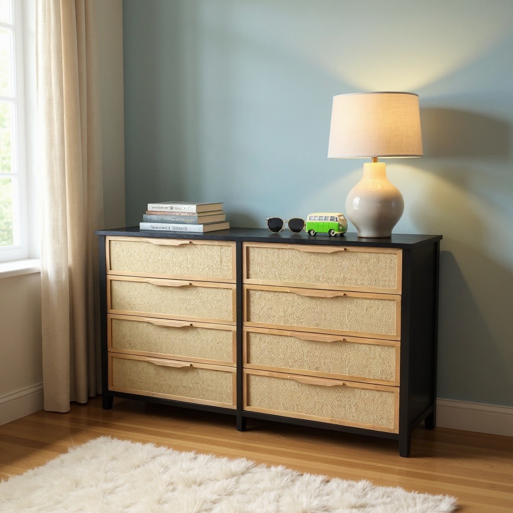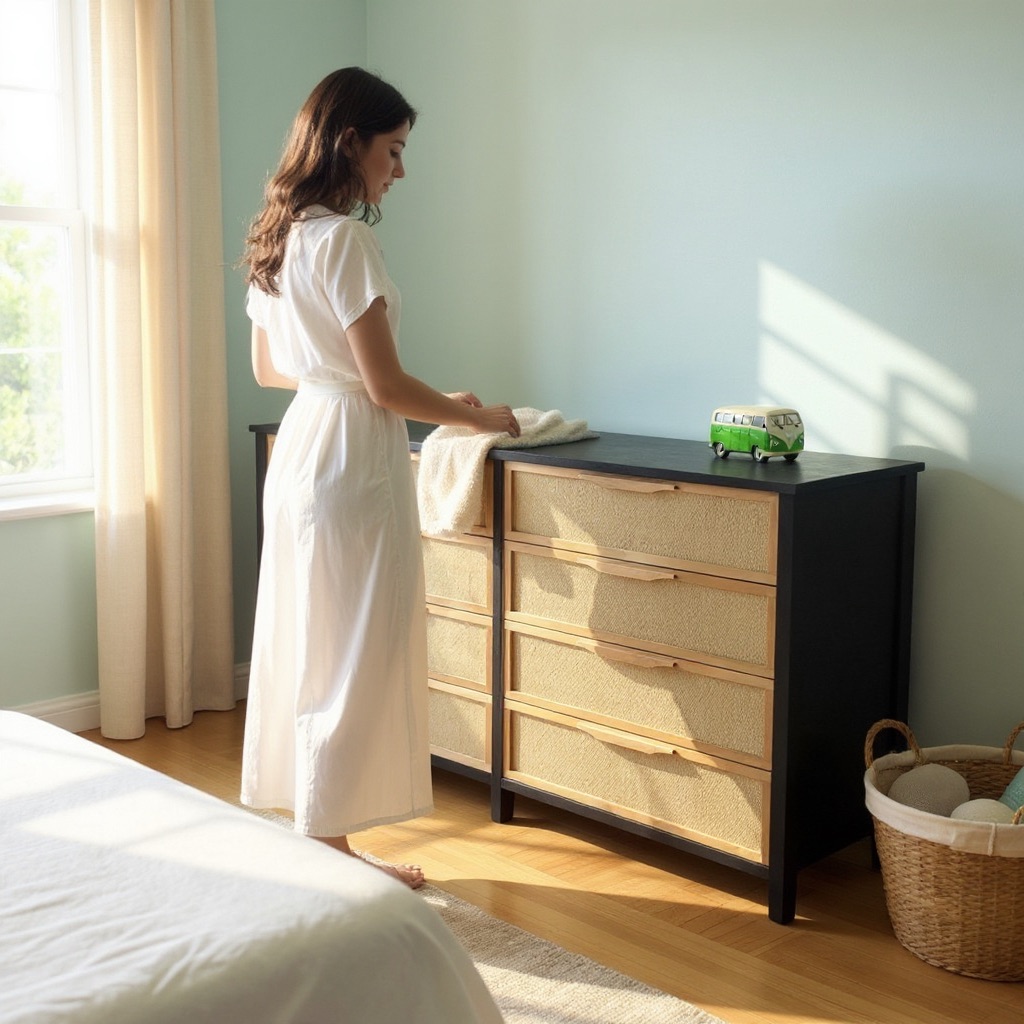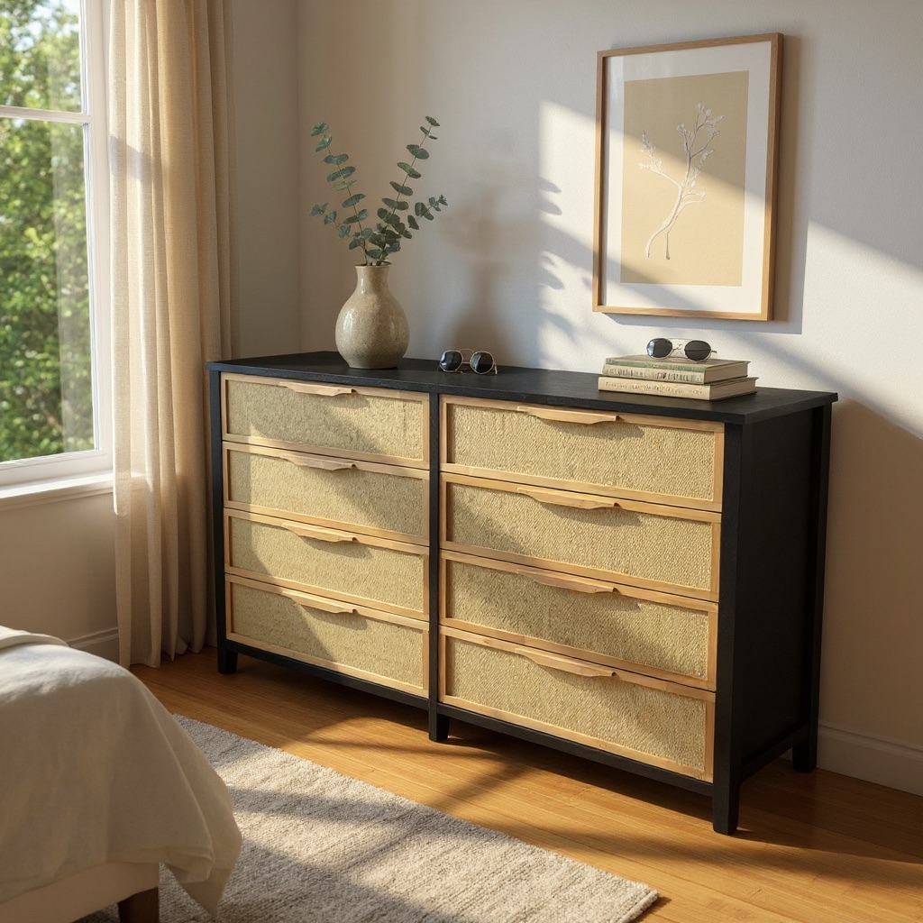 Fabricada en madera maciza de álamo (1era) con tinta color petiribí y terminación en laca poliuretánica con 8 grandes cajones, esta cajonera alta refleja la armonía del estilo Japandi. Cuatro cajones espaciosos con frente entelado en auténtica rafia agregando textura y sofisticación, guías telescópicas asegurando un deslizamiento suave y preciso.
