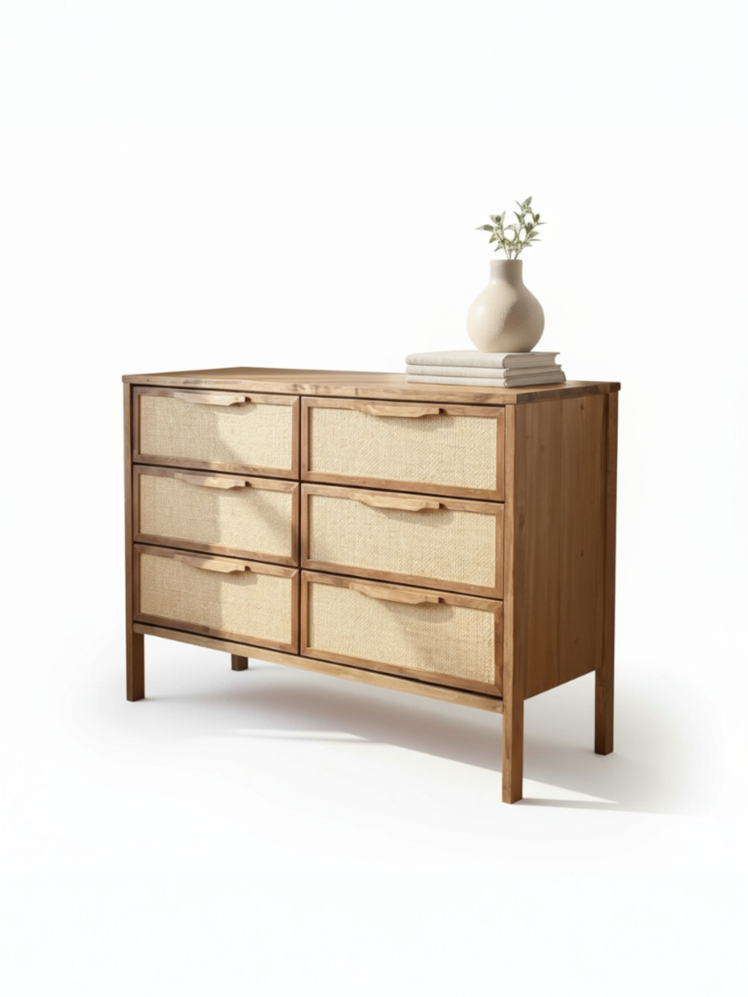 Diseño minimalista y funcionalidad en perfecta armonía. Fabricada en madera maciza de álamo con tinta color petiribí y terminación en laca poliuretánica, esta cómoda combina la calidez natural con líneas depuradas del estilo Japandi. Cuenta con seis cajones amplios y cómodos, con frentes entelados en auténtica rafia que aportan textura y sofisticación. Sus guías telescópicas garantizan una apertura suave y duradera. Disponible en distintas configuraciones para adaptarse a cualquier espacio.