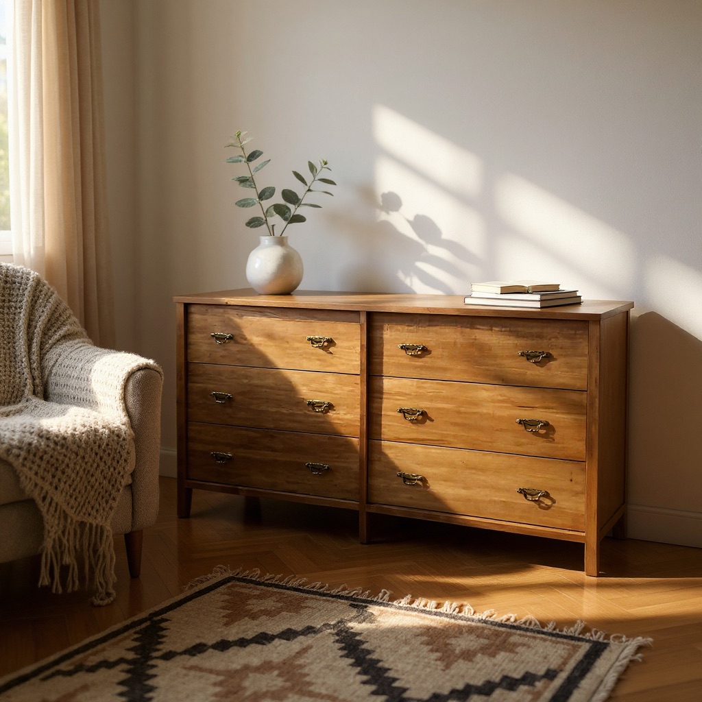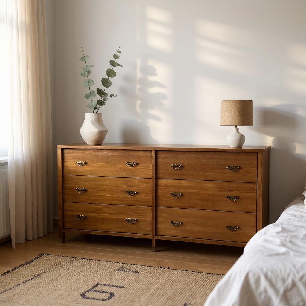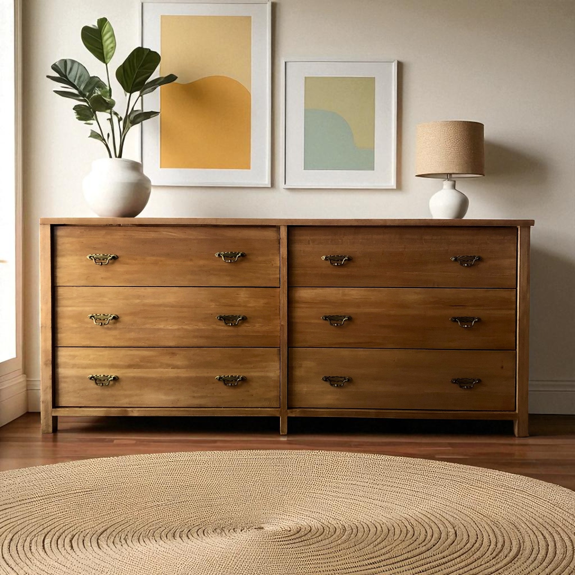 Versión Baja de 6 cajones. Tono roble claro y herrajes vintage