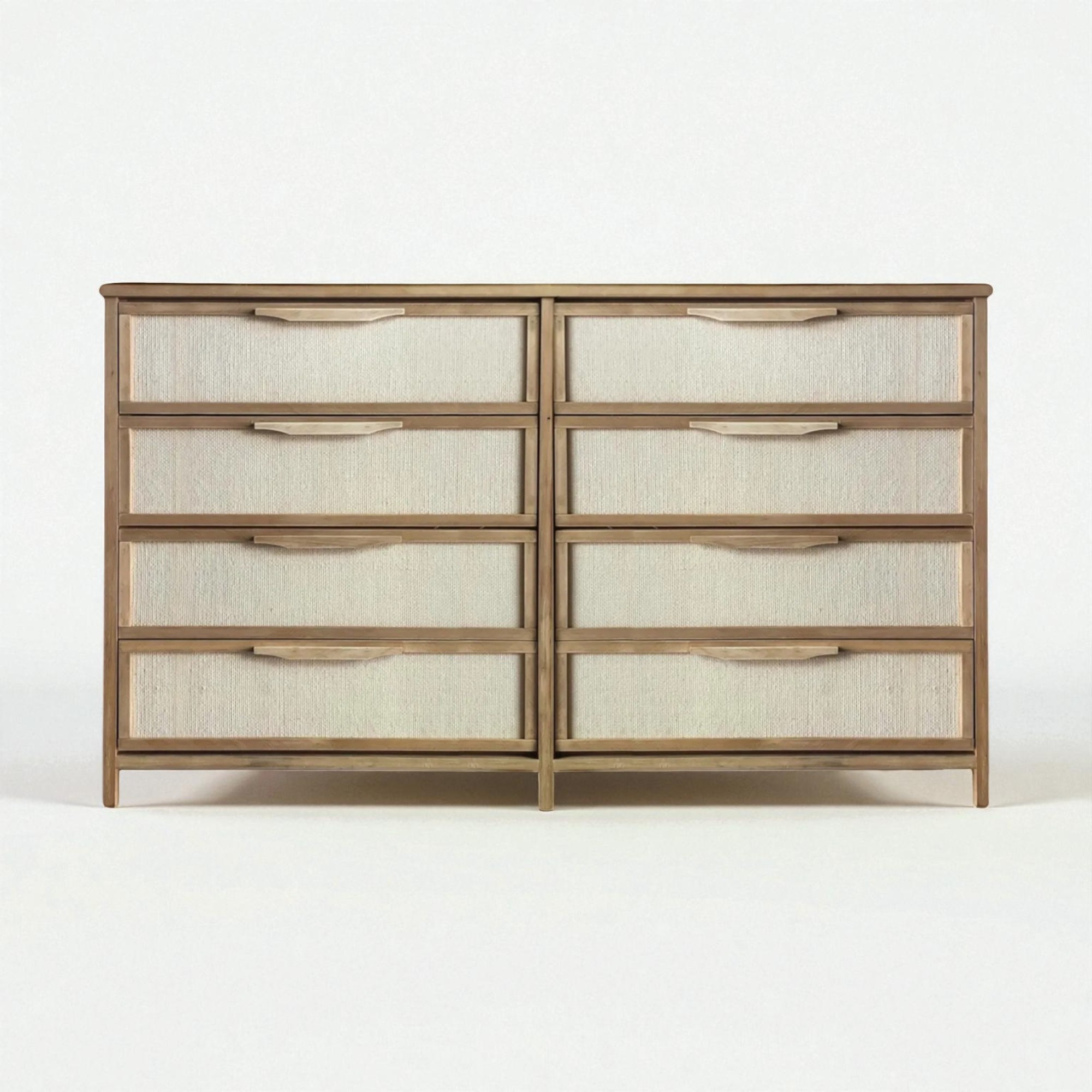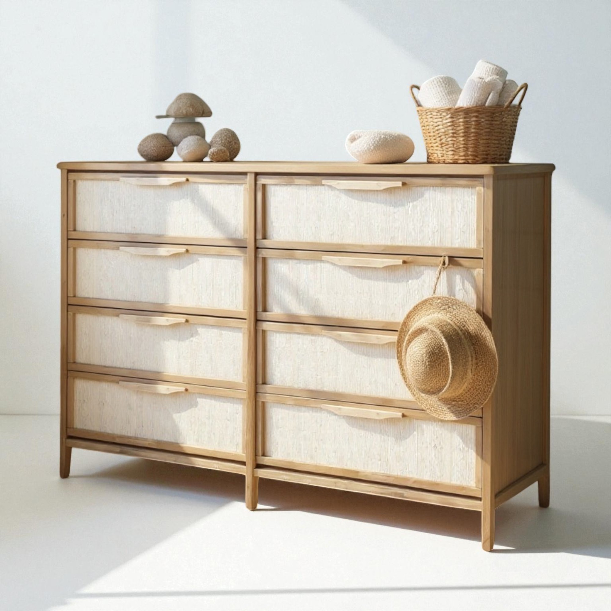 Fabricada en madera maciza de álamo (1era) con tinta color petiribí y terminación en laca poliuretánica con 8 grandes cajones, esta cajonera alta refleja la armonía del estilo Japandi. Cuatro cajones espaciosos con frente entelado en auténtica rafia agregando textura y sofisticación, guías telescópicas asegurando un deslizamiento suave y preciso.